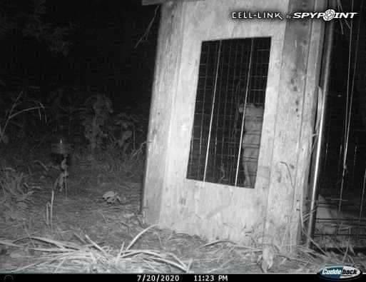 Yogi was visiting and managed to get out the door. He took off and went toward the woods. After a few weeks in the cold he was successfully trapped utilizing a KC trap.